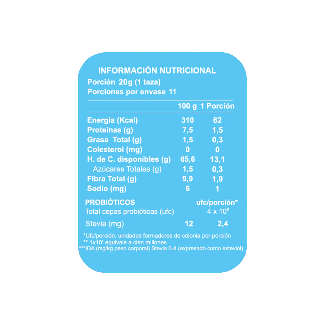 El único cereal en el mercado con 400 millones de Probióticos premium NUP, hechos en Chile con Inteligencia Artificial, que fortalecen tu sistema inmune y digestivo. Vegano, sin gluten, con 0% azúcar añadida y bajo en calorías.