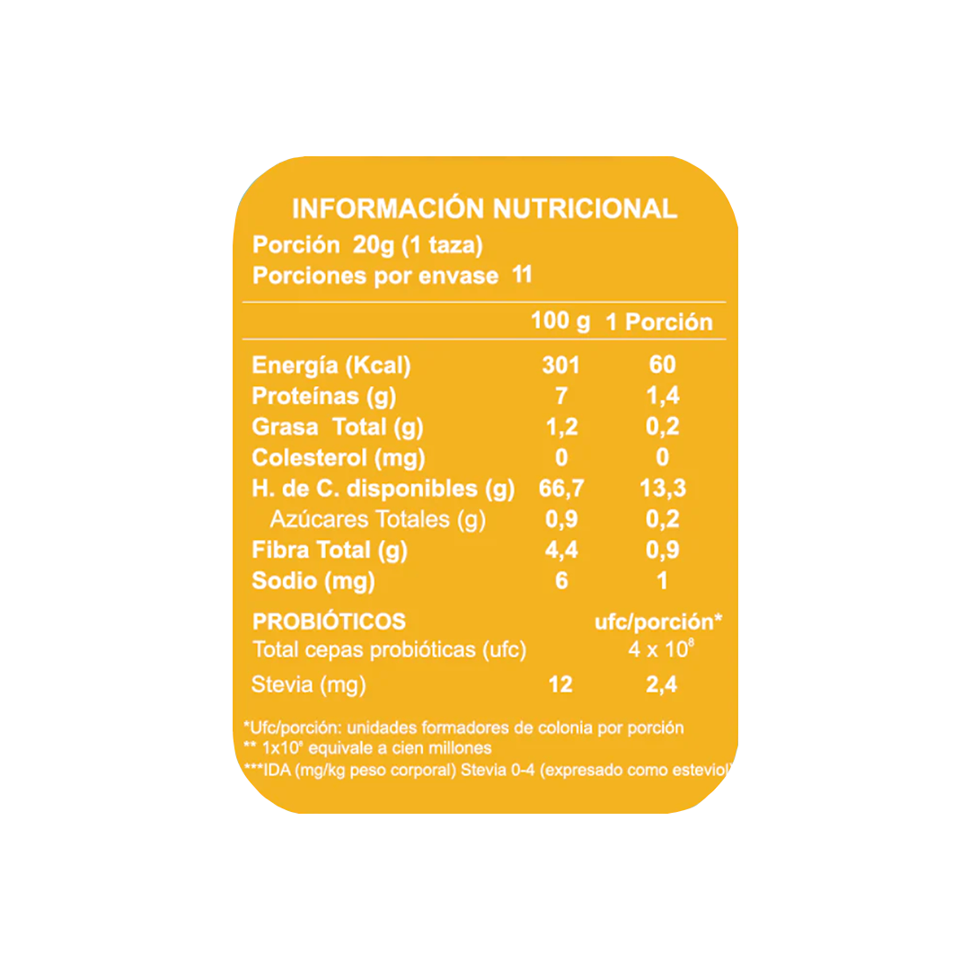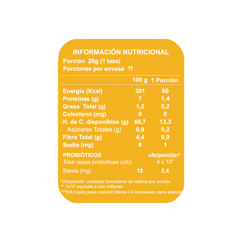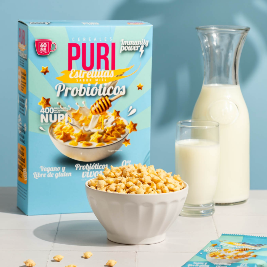 El único cereal en el mercado con 400 millones de Probióticos premium NUP, hechos en Chile con Inteligencia Artificial, que refuerzan tu sistema inmune y digestivo. Vegano, sin gluten, con 0% azúcar añadida y bajo en calorías.