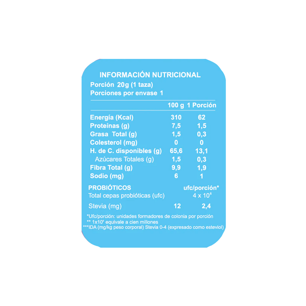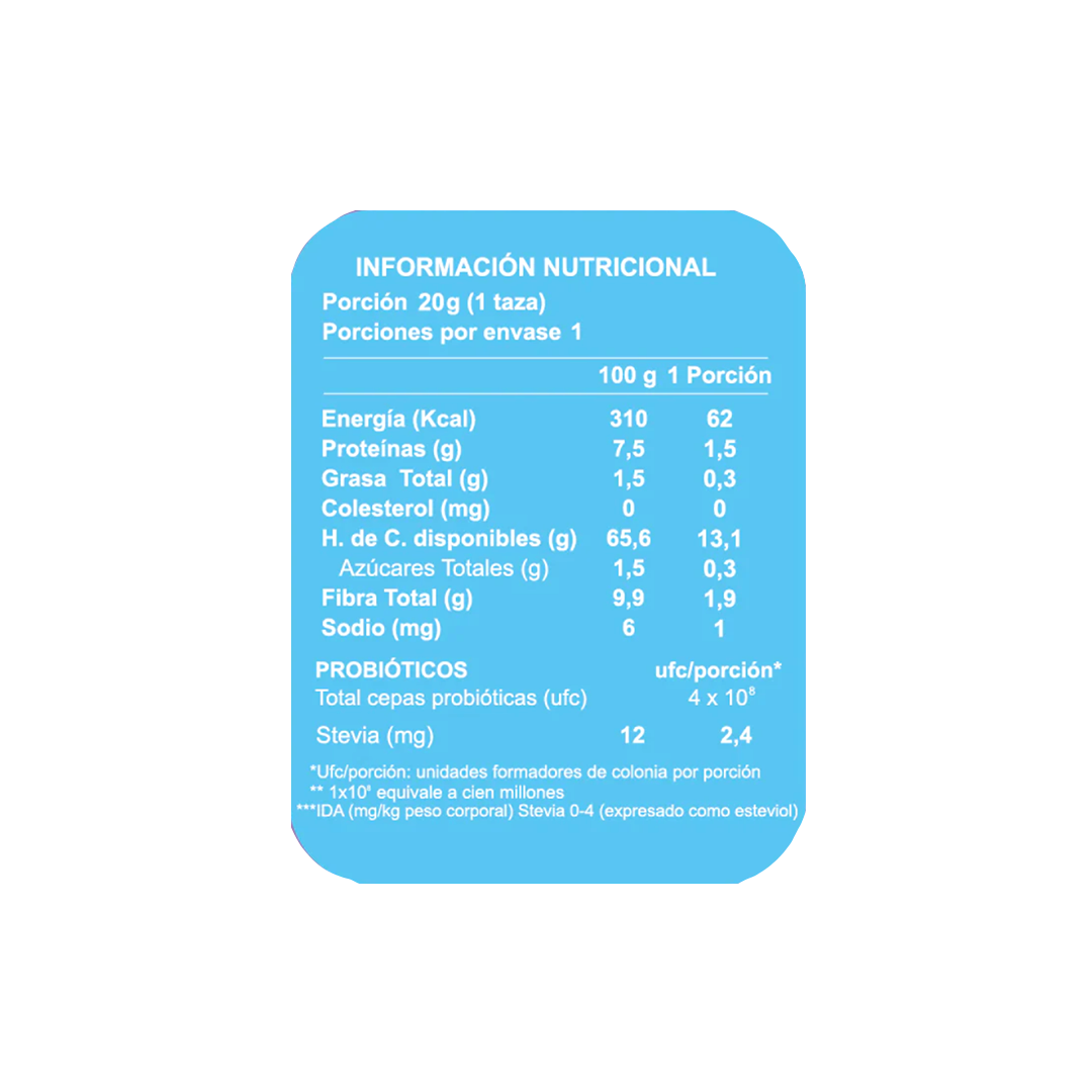 El único cereal en el mercado con 400 millones de Probióticos premium NUP, hechos en Chile con Inteligencia Artificial, que refuerzan tu sistema inmune y digestivo. Vegano, sin gluten, con 0% azúcar añadida y bajo en calorías.