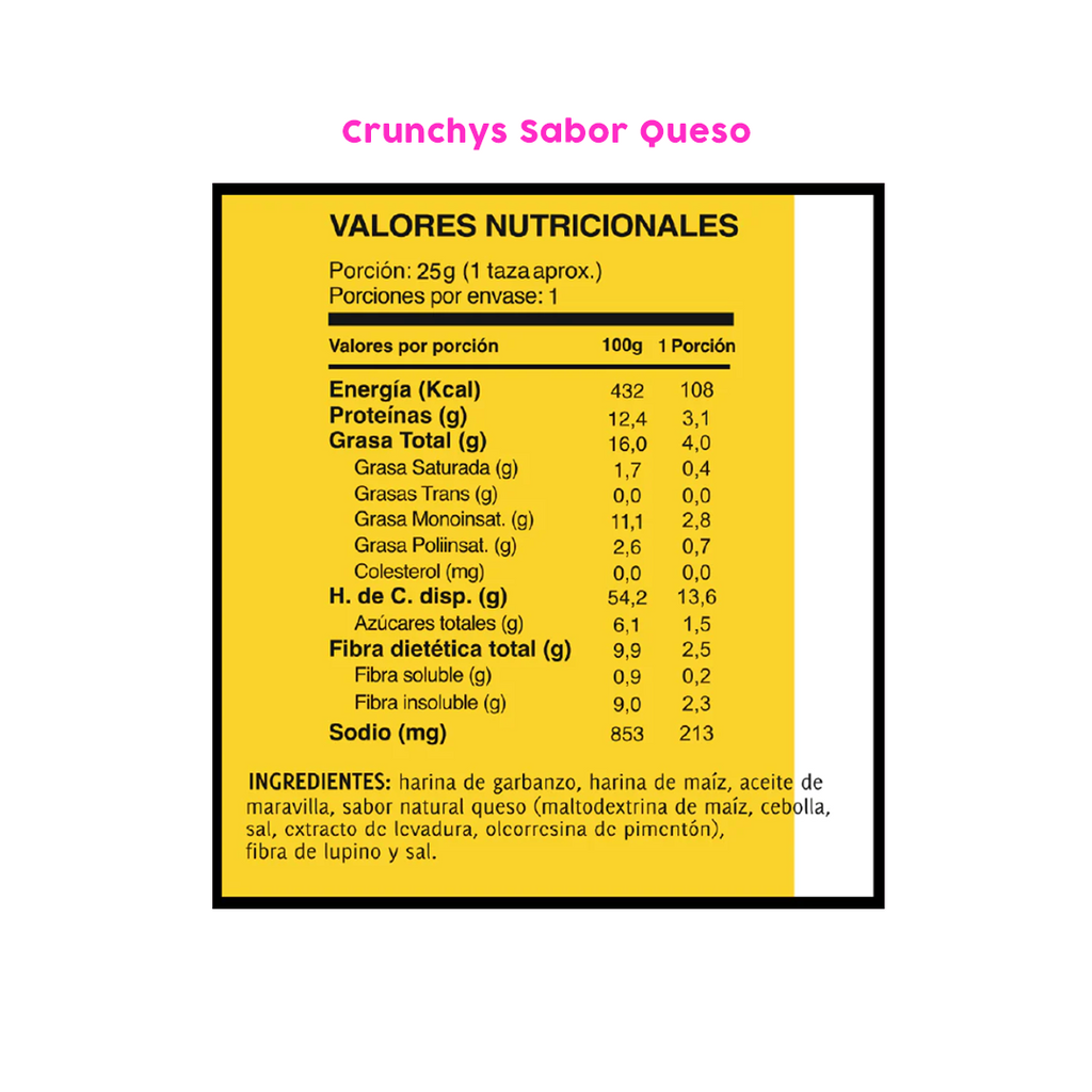 Ingredientes: Harina de garbanzo, harina de maíz, aceite de maravilla, sabor natural queso (maltodextrina de maíz, sal, cebolla, extracto de levadura, saborizante natural, oleorresina, pimentón), fibra de lupino y sal.
