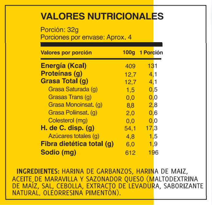 Ingredientes: Harina de garbanzo, harina de maíz, aceite de maravilla, sabor natural queso (maltodextrina de maíz, sal, cebolla, extracto de levadura, saborizante natural, oleorresina, pimentón), fibra de lupino y sal.