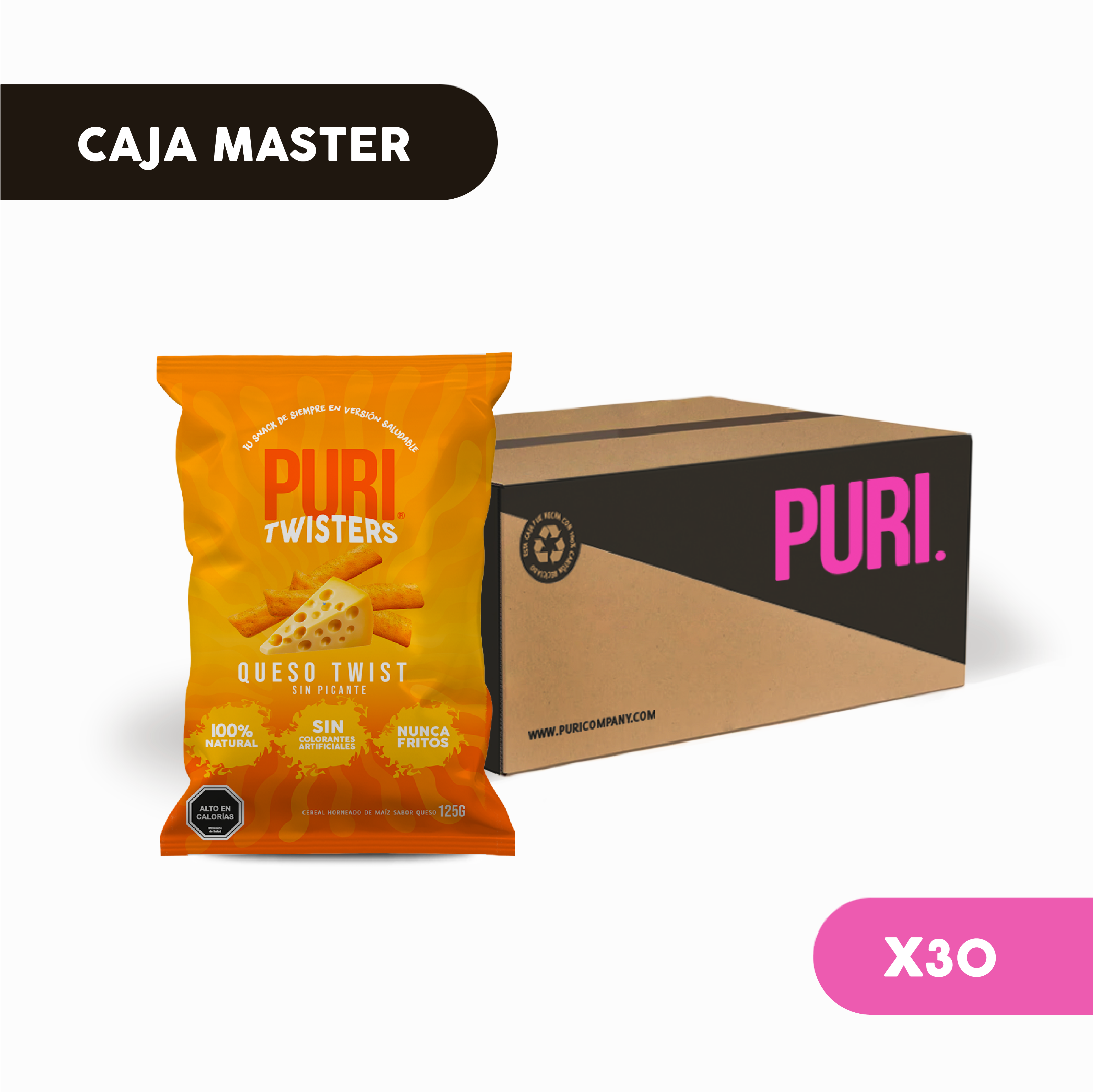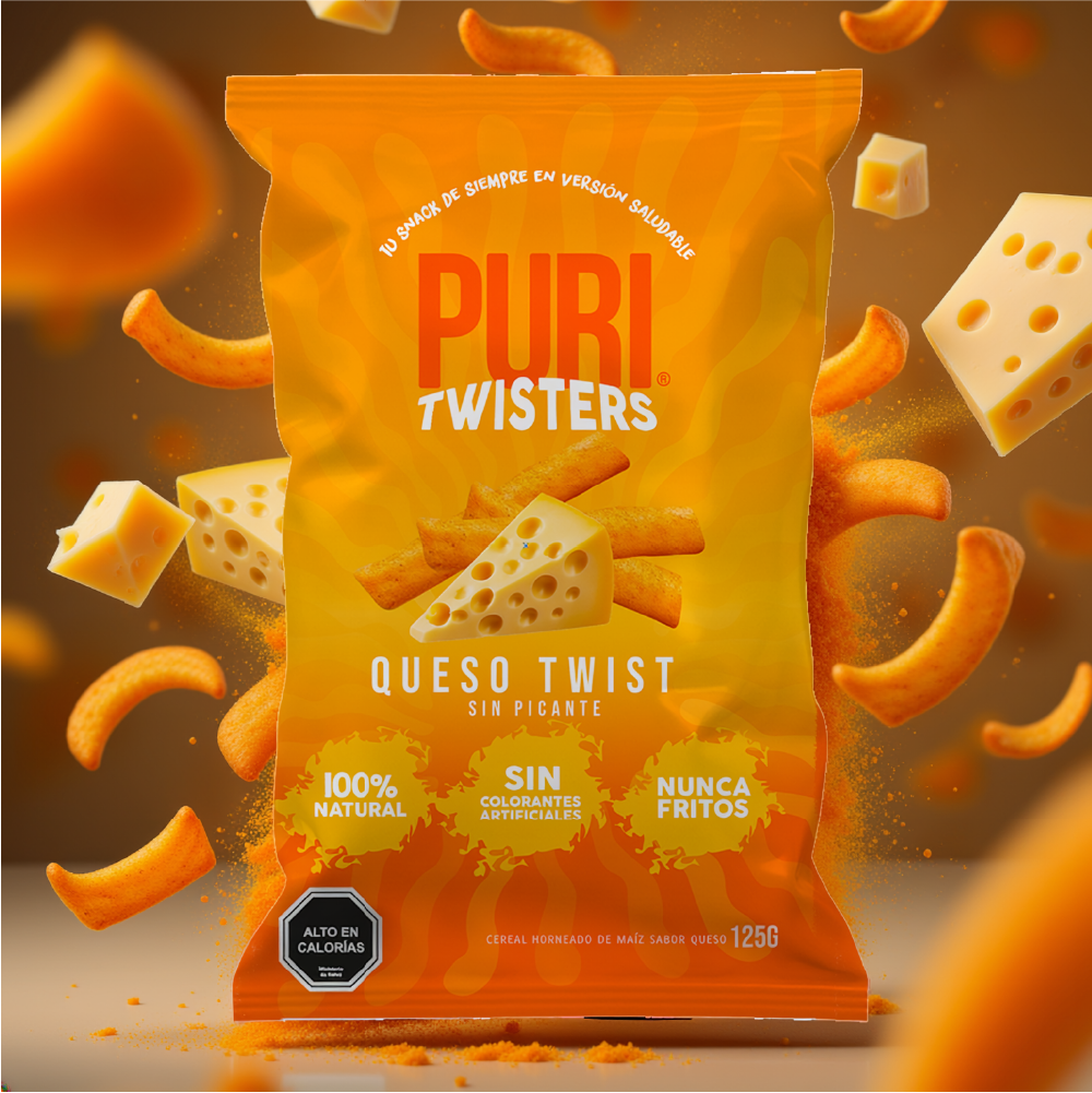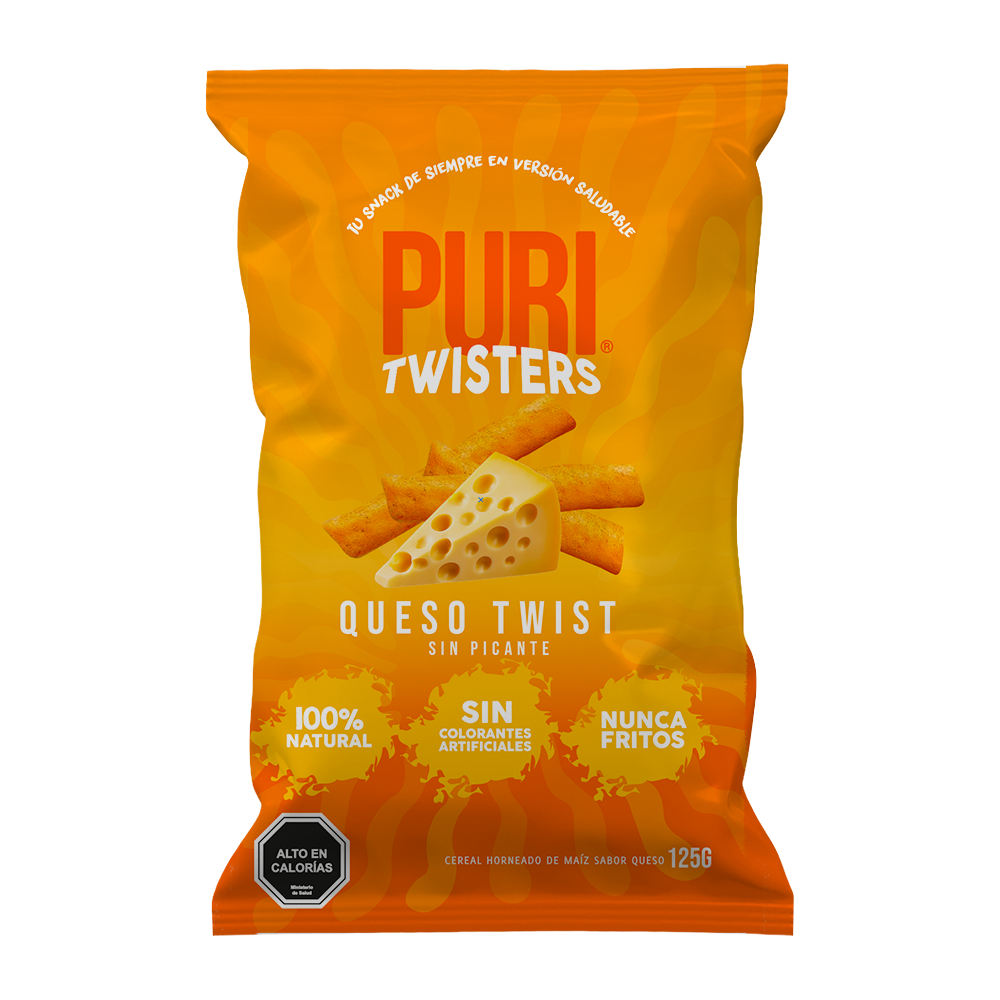 Puri Twisters Queso es un snack crujiente y atrevido, con intenso sabor a queso en versión vegana. Hecho con ingredientes 100% naturales, sin preservantes ni colorantes artificiales y nunca frito, ofrece una experiencia bold y moderna para quienes buscan sabor y actitud sin picante.